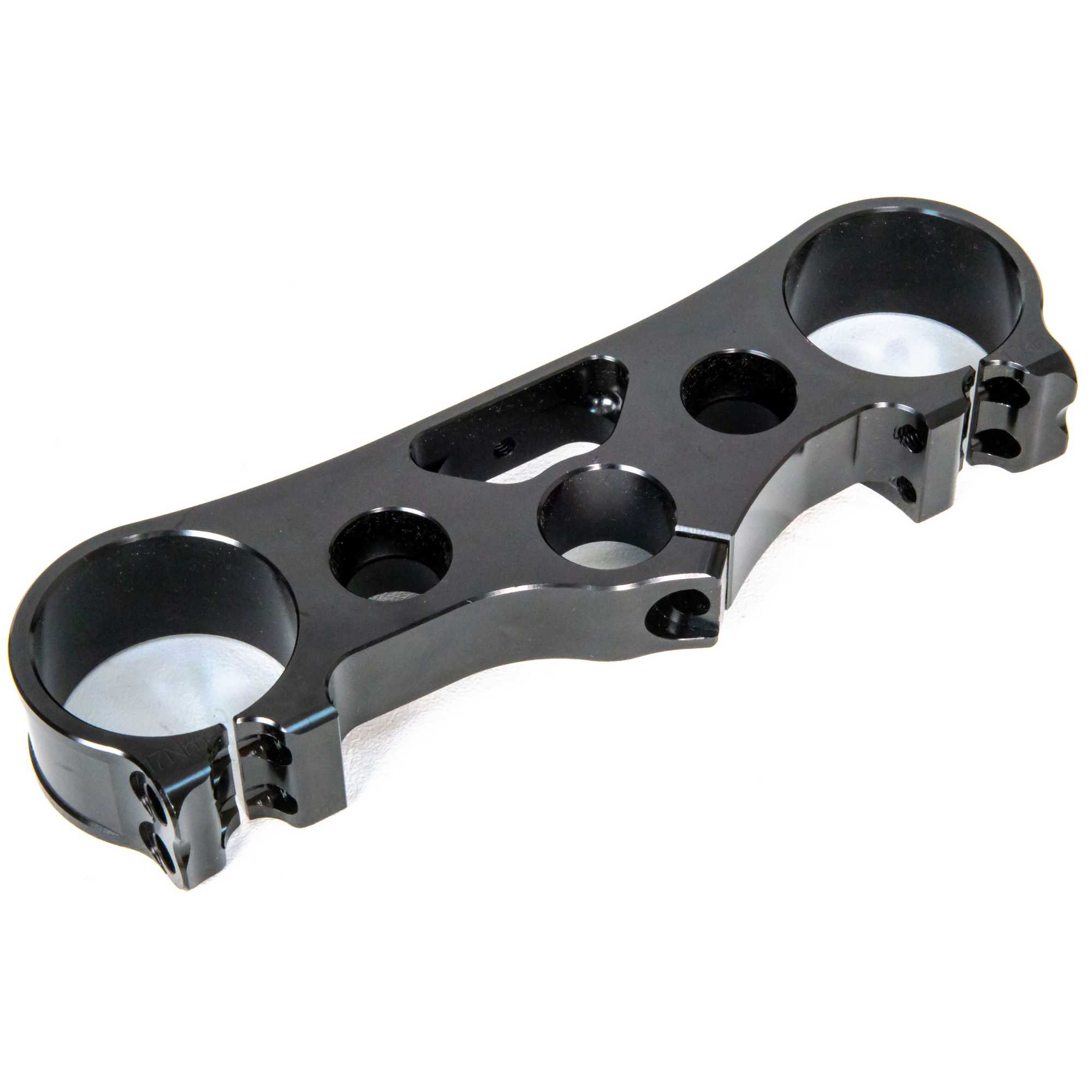 Верхняя траверса (верхний зажим вилки) представляет собой высококачественную деталь, предназначенную для фиксации перьев передней вилки на мотоциклах моделей FX250, FX300 и FX400. Это ключевой элемент подвески, обеспечивающий стабильность и точность управления, особенно в условиях бездорожья или эндуро. Траверса выполнена в черном анодированном цвете, что придает ей матовый, устойчивый к коррозии и износу вид. Она имеет симметричную форму в виде горизонтальной балки с двумя цилиндрическими зажимами (хомутами) на концах. Каждый зажим оснащен разрезом для удобной установки и фиксации перьев вилки с помощью болтов (на фото видны пазы для затяжки). Центральная часть траверсы слегка утолщена для повышения прочности, с крупным круглым отверстием в середине для прохода штока рулевой колонки. По бокам от центра расположены дополнительные монтажные отверстия и выемки для крепления других элементов подвески, таких как защитные кожухи или датчики. Общая длина траверсы указана на фото. Изготовлена из легкого, но прочного алюминиевого сплава, что минимизирует вес без потери жесткости. Это делает ее идеальной для мотокросса или эндуро, где важна балансировка и сопротивление ударам. Траверса устойчива к деформациям. Совместимость и применение: Подходит для мотоциклов FX250, FX300 и FX400 (возможно, аналогичных серий, таких как YX300 или подобных, на основе общих стандартов). Устанавливается в нижней части передней вилки, соединяя ее с рамой и обеспечивая синхронное движение перьев. Рекомендуется для замены оригинальной детали при тюнинге, ремонте или после повреждений. Для установки требуется стандартный набор инструментов (торцевые ключи, динамометрический ключ для правильной затяжки болтов).